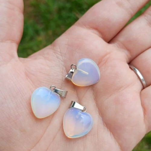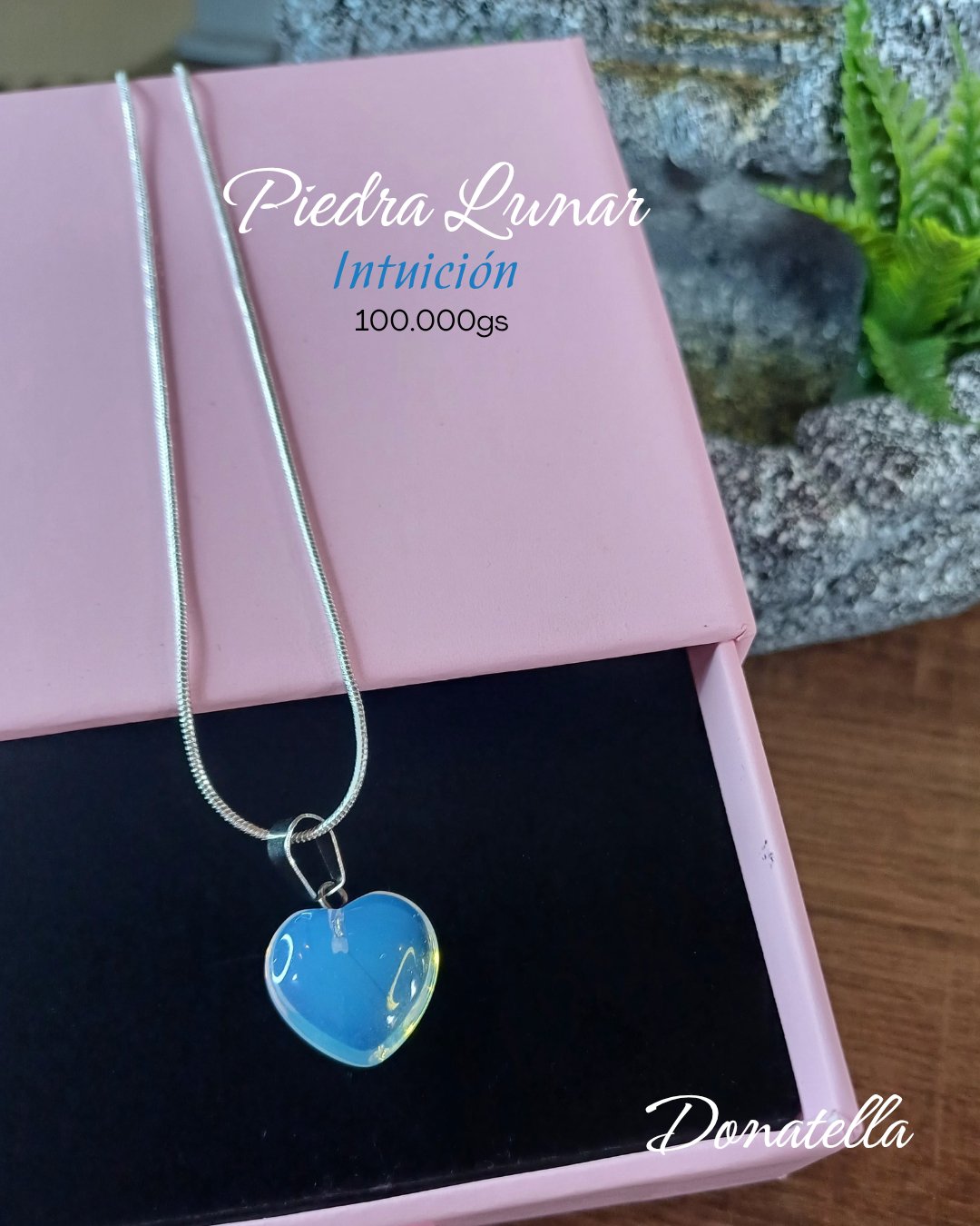 Dije de piedra lunar en forma de corazón, ideal como amuleto de intuición y armonía emocional.