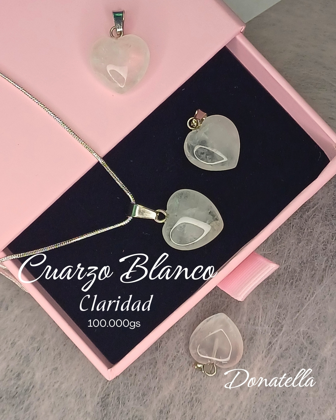 Dije de cuarzo blanco en forma de corazón, ideal como amuleto de claridad, equilibrio y sanación.